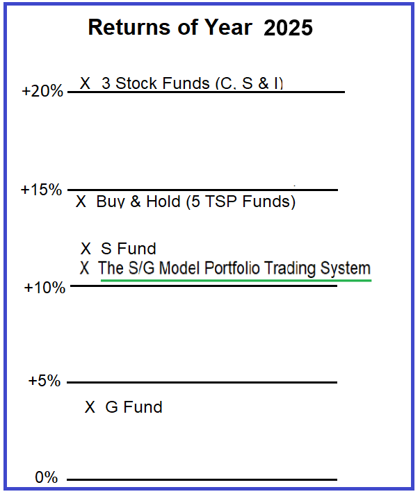 Our S/G Model Portfolio Trading System™ profited +10.27%. The buy-and-hold allocation (20% in each fund) returned +14.66%, while the G Fund gained +4.44%. While this marked the first time our model slightly trailed the buy-and-hold approach, results remained broadly in line with the S Fund and well ahead of the G Fund.